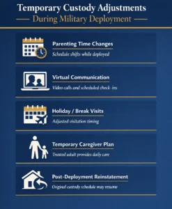 Temporary custody modifications may address communication schedules, caregiving arrangements, and parenting time adjustments. Once deployment ends, courts often review whether the original parenting plan should resume.