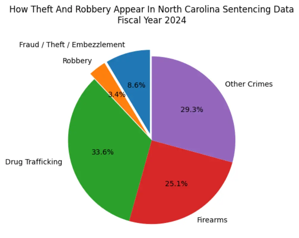 This sentencing data helps place theft cases in context within North Carolina’s criminal justice system. While offenses like drug trafficking and firearms account for a larger share of sentenced cases statewide, theft and related property crimes remain distinct and regularly prosecuted categories.